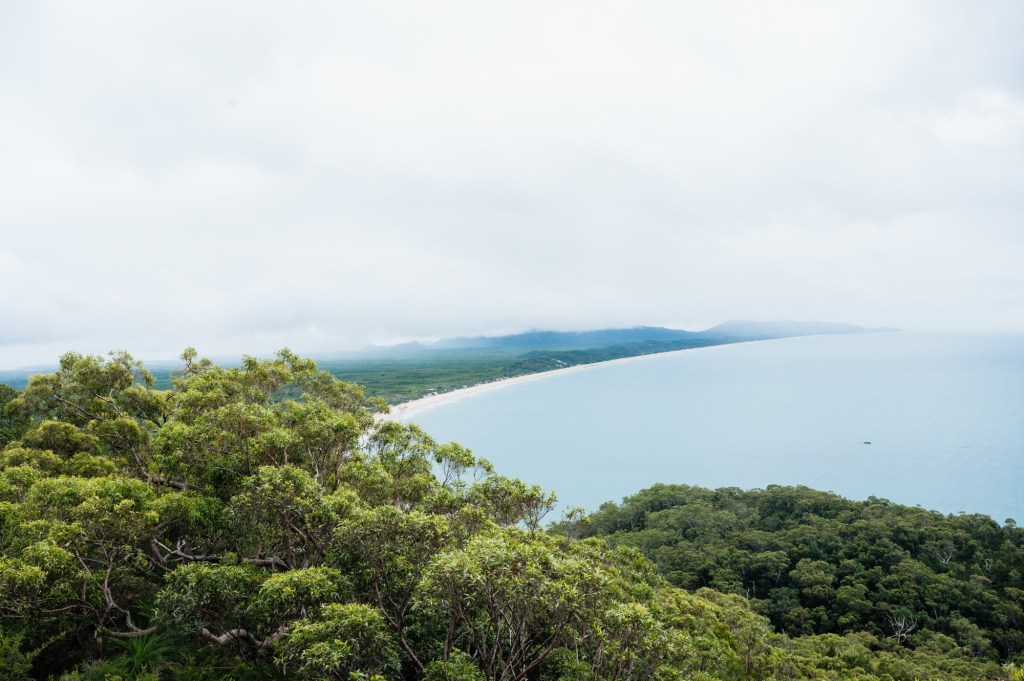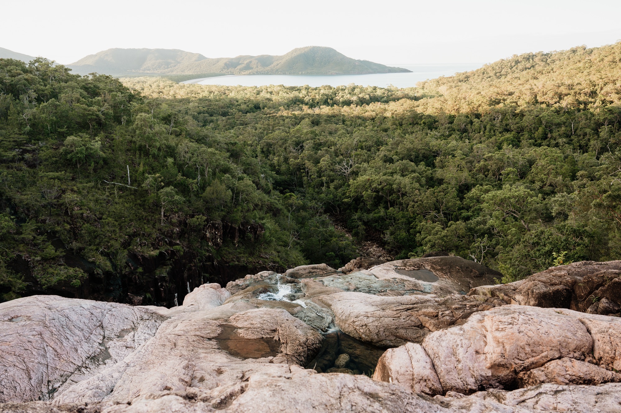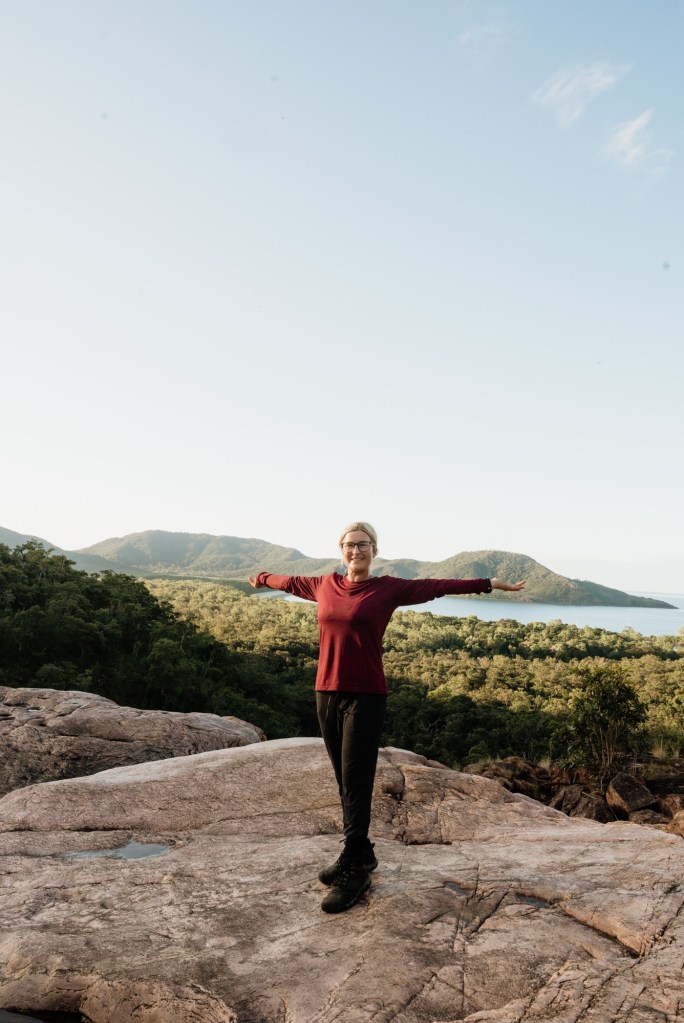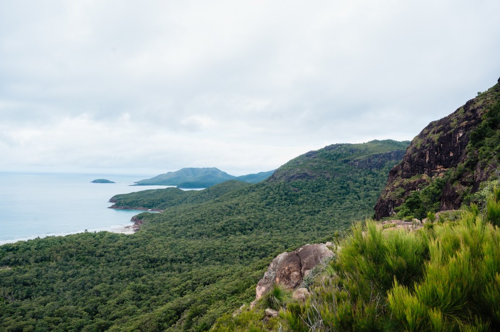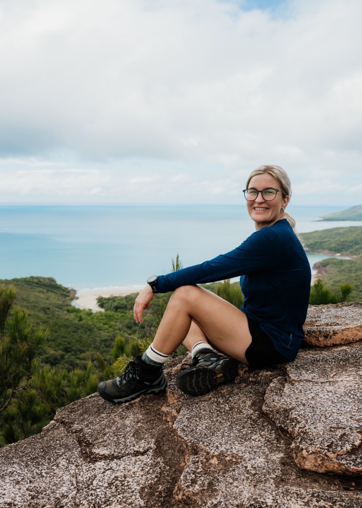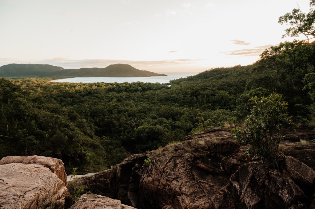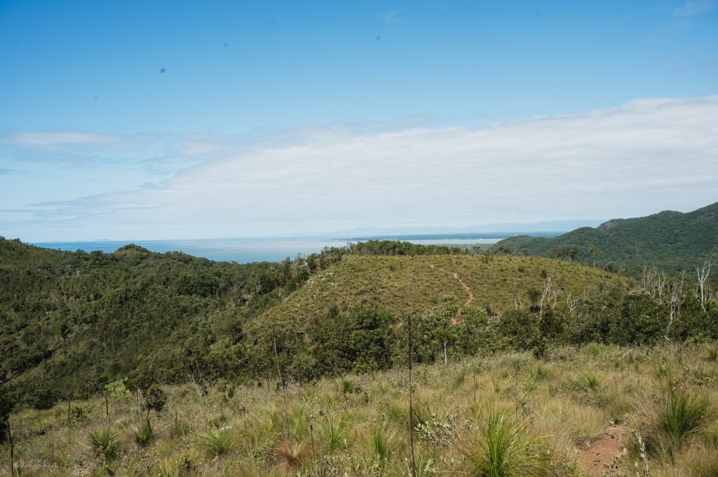 As you climb higher, the views begin to open — first glimpses of Nina Bay below, then sweeping coastal vistas that stretch far along the island. Reaching the top feels incredibly rewarding. From the summit, the scale of Hinchinbrook truly reveals itself: rugged mountains rising behind you, endless coastline ahead, and the Coral Sea beyond.