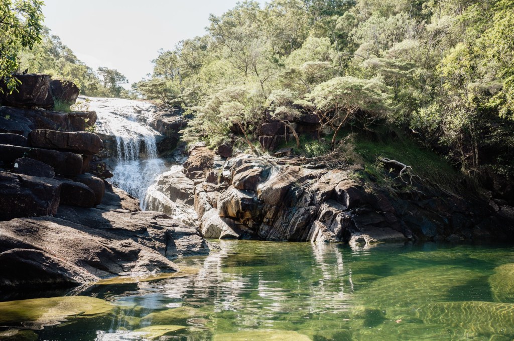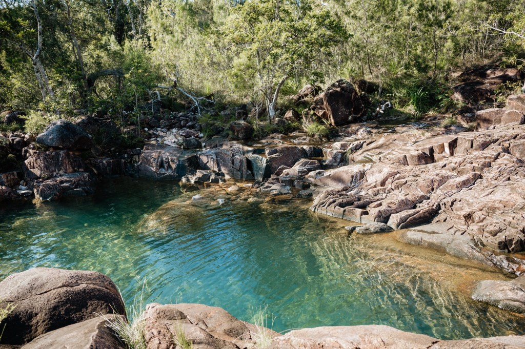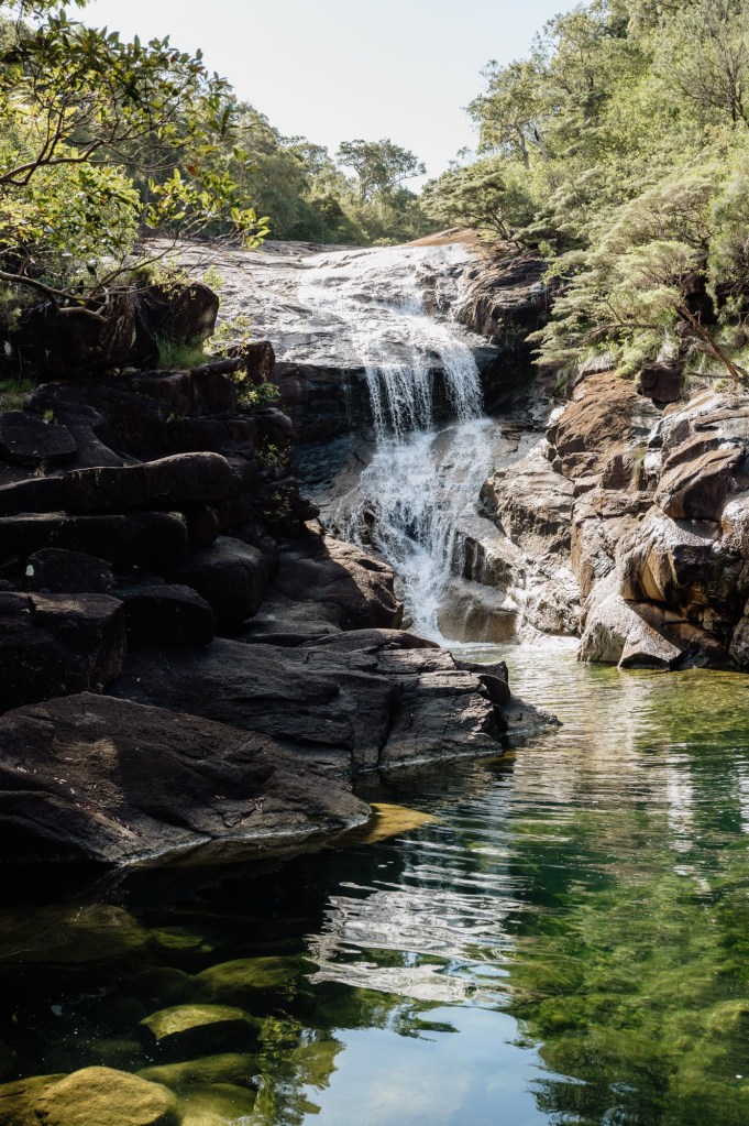 Approaching Bankisia Bay, the trail turns inland and begins to climb. Natural rock steps wind through scrub and open forest, offering a welcome break from the coast. Not far beyond — around 250 metres past the Bankisia Bay turn-off — you’ll find an ideal smoko stop beside a crystal-clear pool. It’s the perfect place to brew a cuppa, cool off, and reset before pushing on.